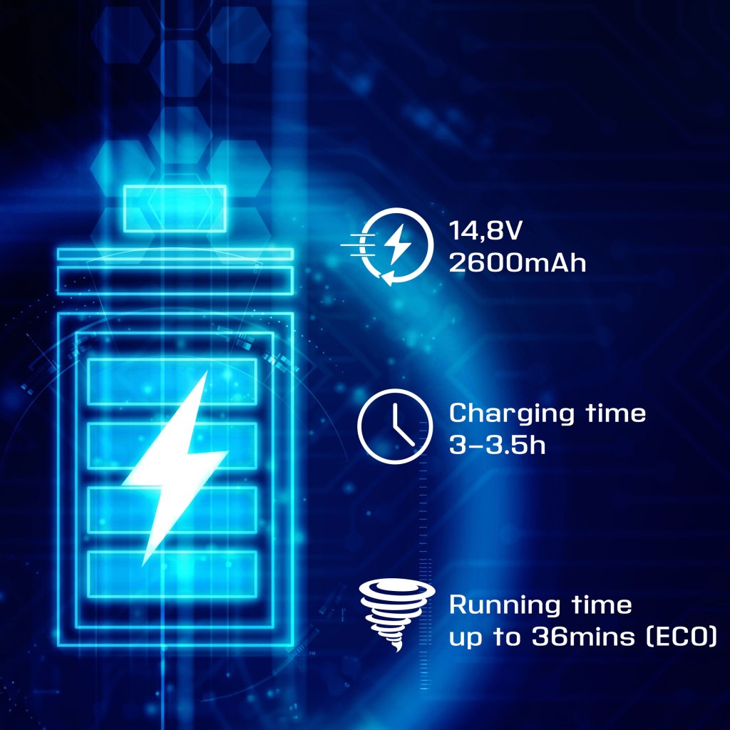 S 14,8 V lithium-iontovým akumulátorem s kapacitou 2600 mAh získáte až 25 minut nepřetržitého vysávání bez ztráty výkonu, a díky rychlému nabíjení za pouhé 3 až 3,5 hodiny bude váš vysavač vždy připraven k akci.