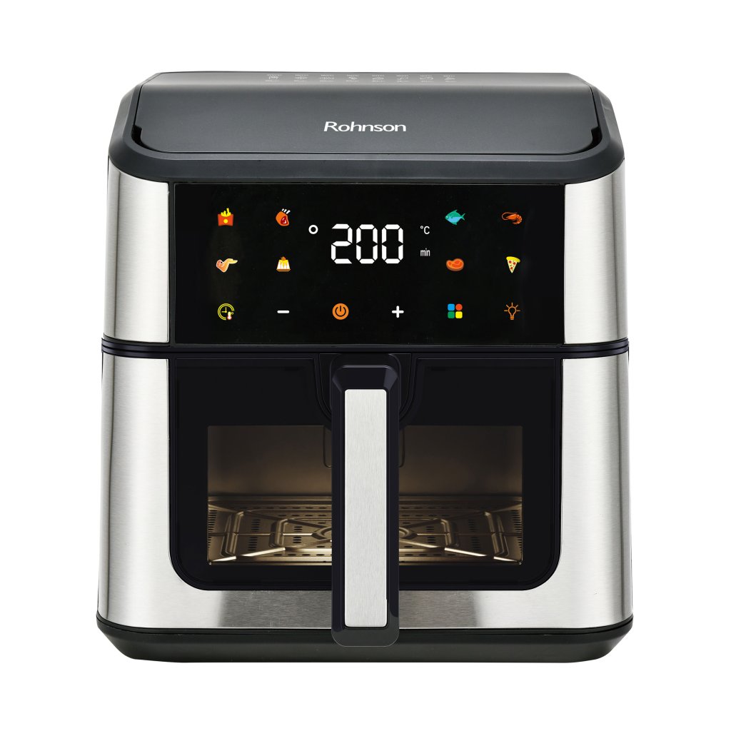 Barevný LED dotykový panel nabízí 8 automatických programů pro snadnou volbu ideálního režimu. Teplotu můžete ručně nastavit v rozmezí 80–200 °C a využít časovač až na 60 minut s automatickým vypnutím. Díky průzoru a vnitřnímu osvětlení máte neustálý přehled o průběhu přípravy.