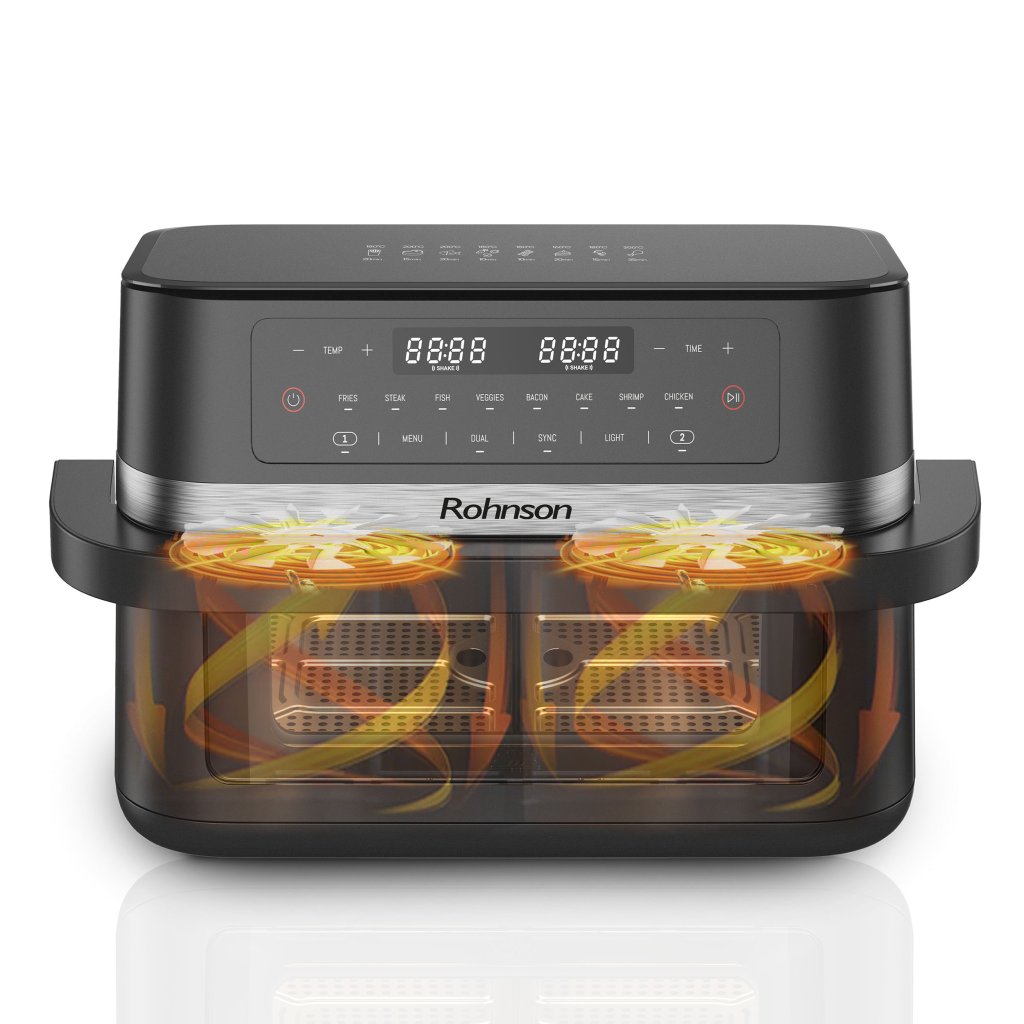 Moderní horkovzdušná fritéza 2v1 s extra silným výkonem a dvouzónovým košem přináší zdravější a pohodlnější způsob vaření pro celou rodinu.