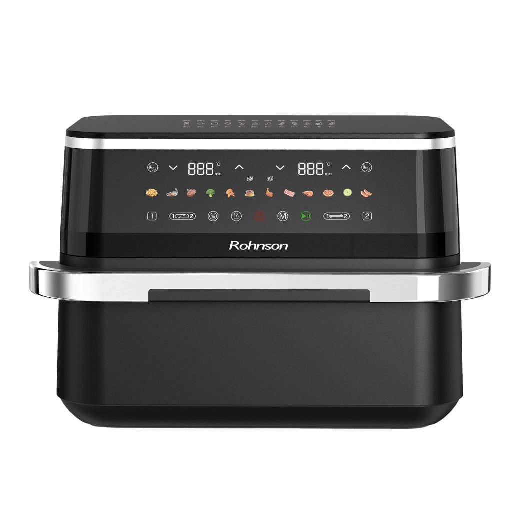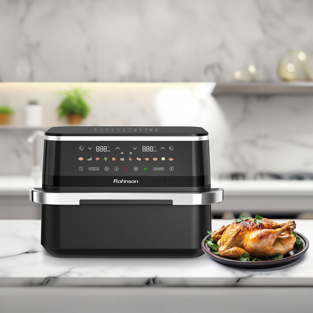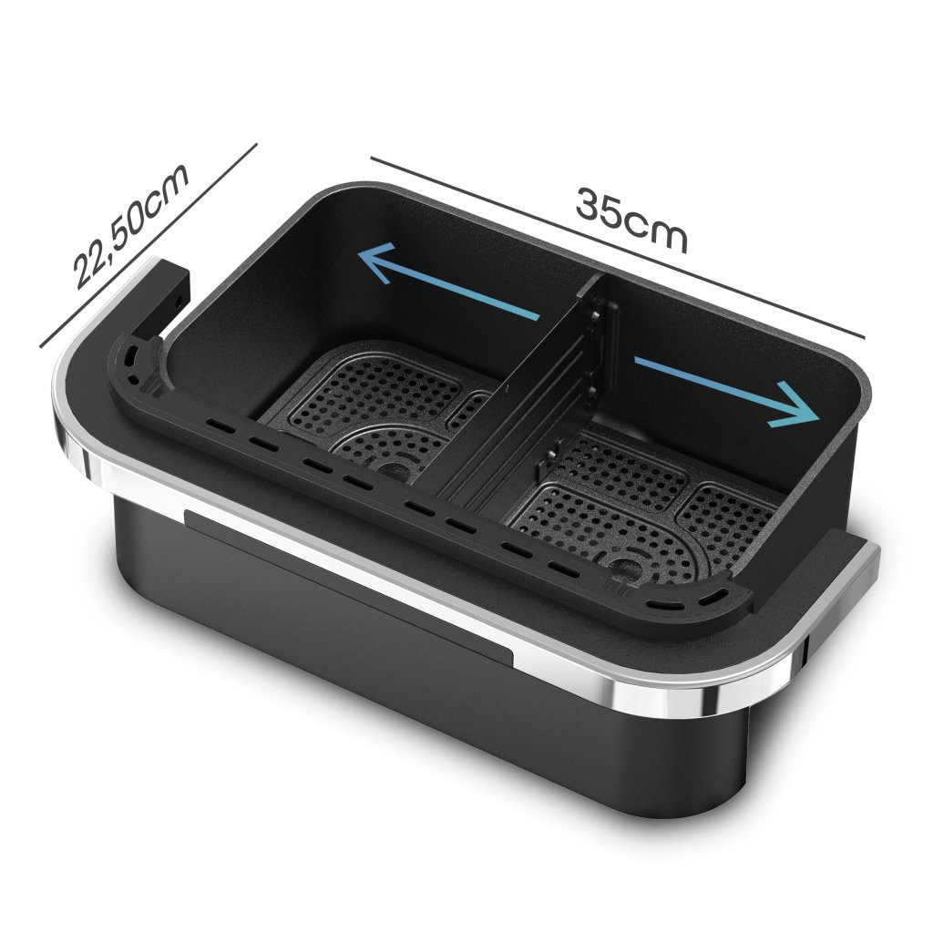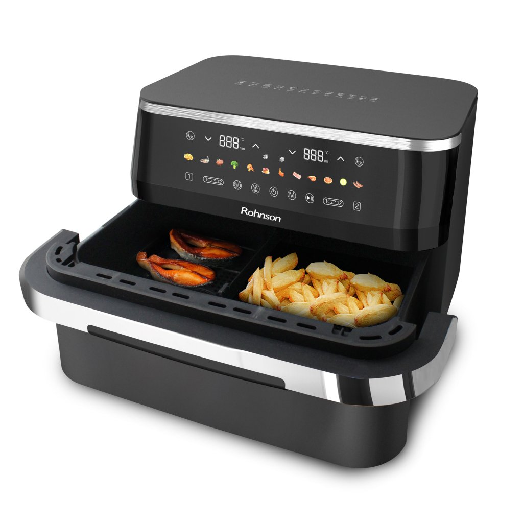 Horkovzdušná fritéza 2 v 1 s dvouzónovým košem přináší revoluci v domácím vaření. Umožní vám připravit dvě různá jídla najednou, aniž by se chutě promíchaly. S extra velkým objemem devět litrů a možností rozdělení na dvě části je ideální pro větší rodiny i hostiny. Navíc připravíte jídlo s až o osmdesát procent méně tuku, což zaručuje zdravější stravování bez kompromisů na chuti.