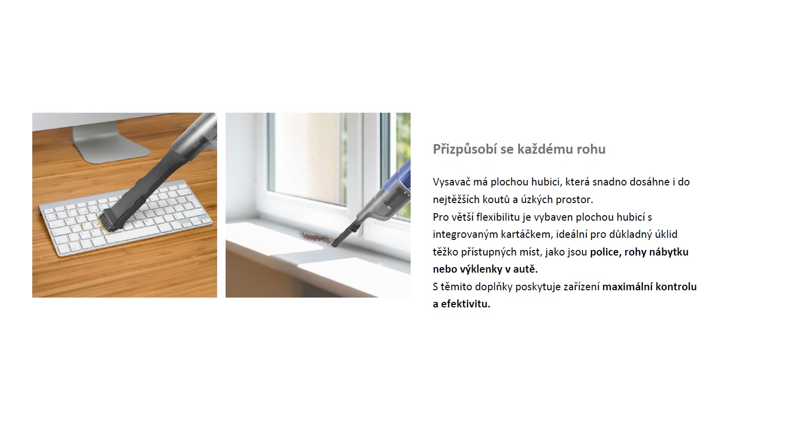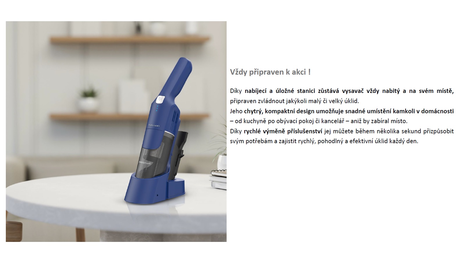 Jeho dlouho‑životnostní lithium‑iontová baterie vydrží v plném nasazení déle, než čekáte, a dvojitá filtrace s HEPA prvkem udrží vzduch svěží i v malém bytě. Stačí ho vzít ze stylové nabíjecí základny a jediným tahem projedete kouty, kam se tradiční vysavače vůbec nedostanou.