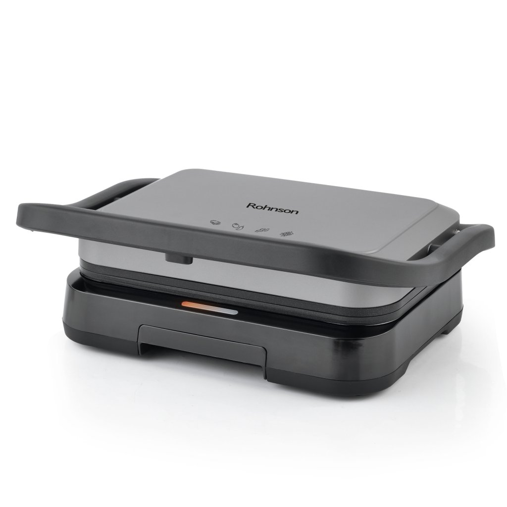 Nepřilnavý povrch bez PFAS zajišťuje zdravější přípravu pokrmů a snadné čištění bez zbytečného drhnutí. Gril lze otevřít až do 180°, takže ho pohodlně využijete i jako klasický stolní gril. Odkapávací miska zachytí přebytečný tuk, protiskluzové nožičky zajistí stabilitu a světelné indikátory vás spolehlivě informují o provozu a připravenosti k pečení.