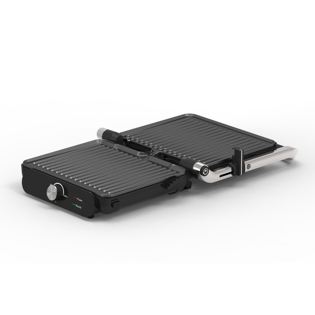 Velkou výhodou je možnost otevření grilu do plochy (180°), čímž se z něj stává praktická grilovací plocha pro větší množství jídla – ideální při vaření pro více osob. Provoz a připravenost signalizují přehledné světelné kontrolky, zatímco protiskluzové nožičky zajišťují stabilitu během používání. Výkonný motor s příkonem 2000 W navíc zajišťuje rychlé nahřátí i rovnoměrné propečení bez ztráty šťavnatosti.