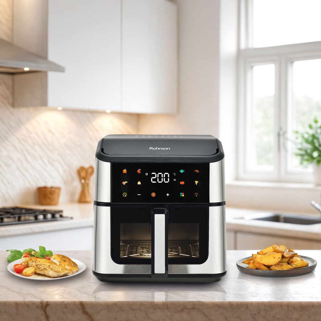 Barevný LED dotykový panel nabízí 8 automatických programů pro snadnou volbu ideálního režimu. Teplotu můžete ručně nastavit v rozmezí 80–200 °C a využít časovač až na 60 minut s automatickým vypnutím. Díky průzoru a vnitřnímu osvětlení máte neustálý přehled o průběhu přípravy.