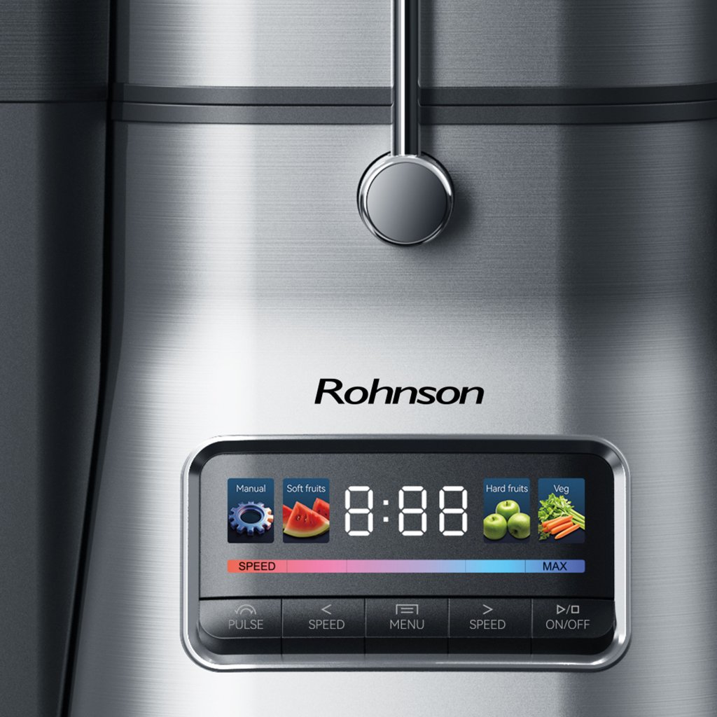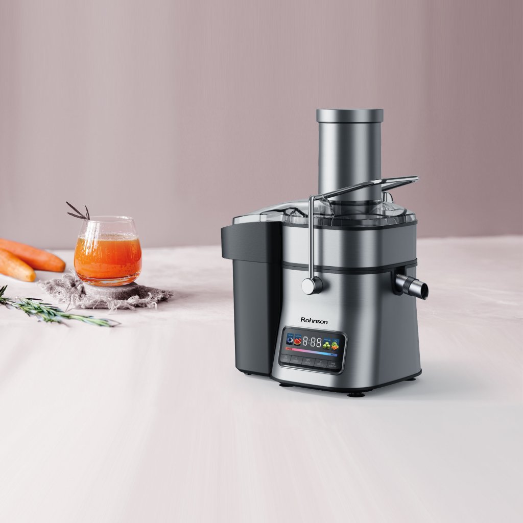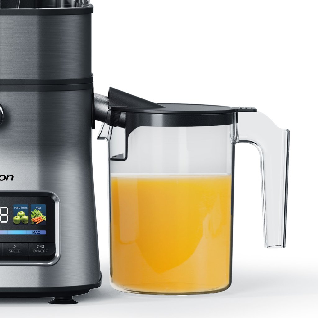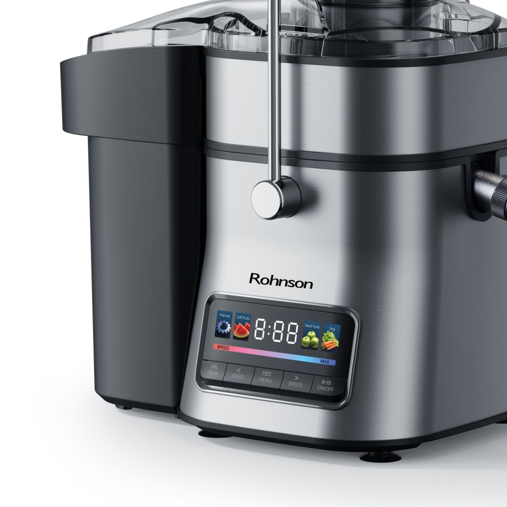 Extra široký plnicí otvor o průměru 84 mm pojme celé kusy ovoce i zeleniny, takže ušetříte čas s jejich krájením. Moderní barevný digitální displej a ovladač s pěti rychlostmi vám dávají plnou kontrolu nad výkonem – od jemného zpracování měkkého ovoce až po rychlé odšťavnění tvrdší zeleniny.