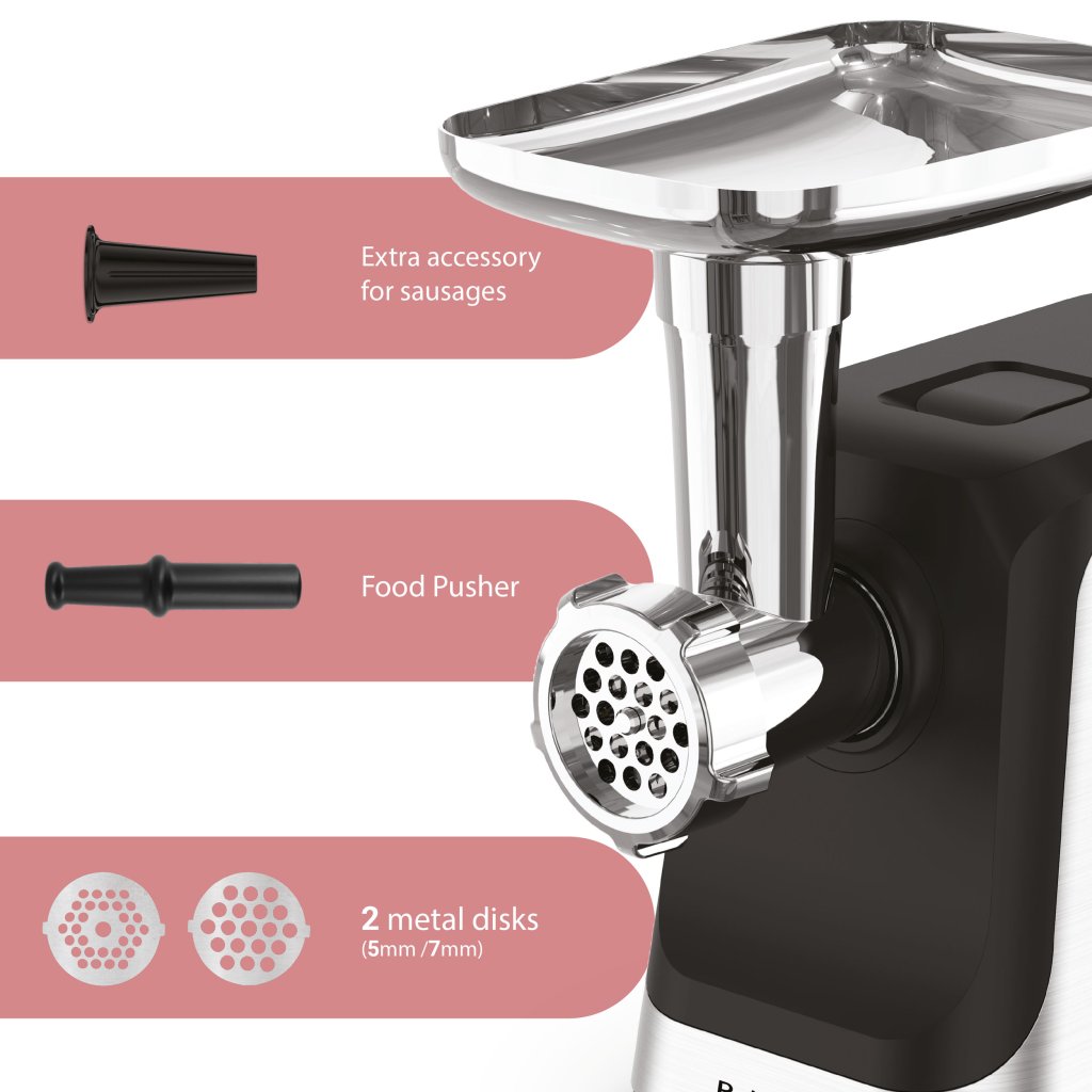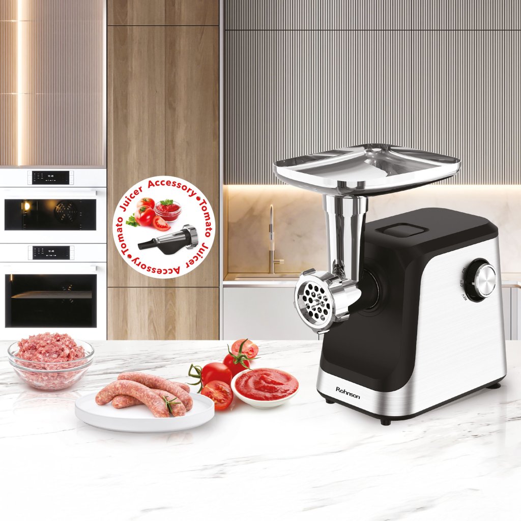Tento multifunkční mlýnek na maso a rajčata 2v1 je vybaven výkonným celoměděným motorem s příkonem až 2000 W, což zajišťuje nejen dlouhou životnost, ale také vysoký výkon – zvládne zpracovat až 2 kg masa za minutu. Ať už připravujete domácí burgery, klobásy nebo rajčatový protlak, díky přiloženým nástavcům zvládnete vše rychle, efektivně a s minimální námahou.
