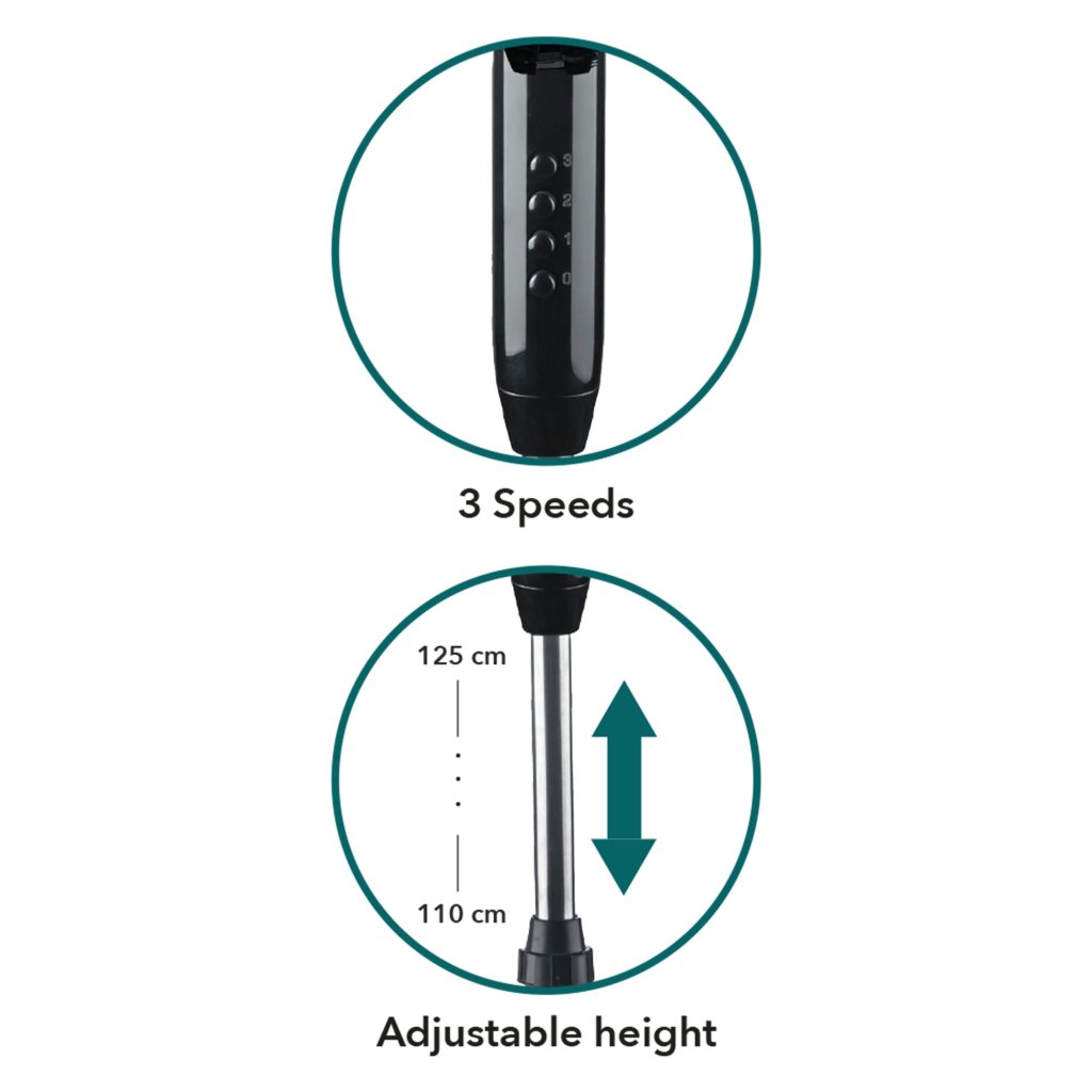 Vyberte si ze 3 rychlostí proudění vzduchu podle aktuální potřeby a využijte 80° oscilaci, která rovnoměrně rozprostře vzduch po celé místnosti. Díky nastavitelnému úhlu sklonu a výšce v rozmezí 110–125 cm si proudění snadno přizpůsobíte přesně podle sebe.