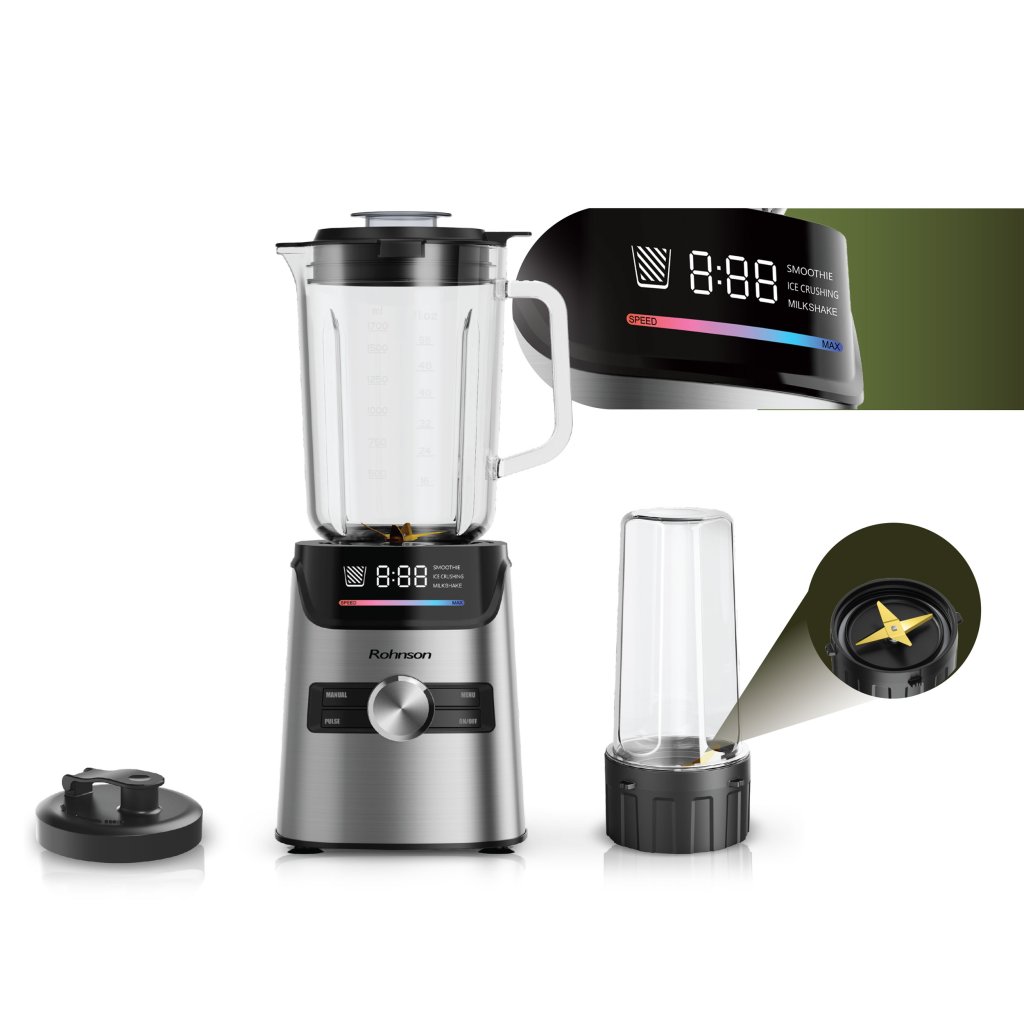 Barevný ovládací panel zpříjemní ovládání a nabídne tři automatické programy pro nejoblíbenější nápoje i funkci samočištění. Součástí je také praktická mixovací láhev o objemu 600 ml bez BPA se čtyřmi titanovými noži, ideální pro přípravu nápojů na cesty.